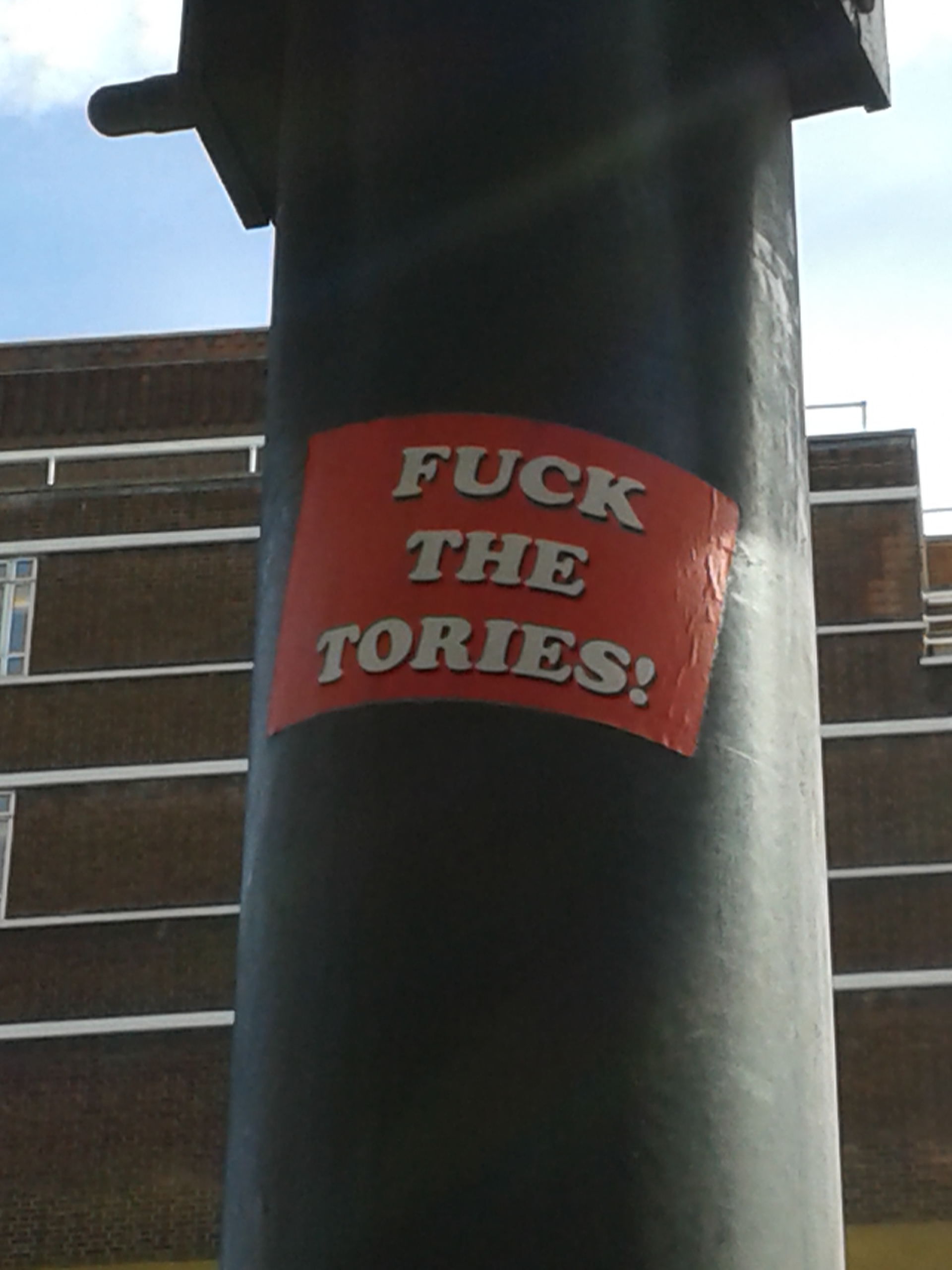 There was a decidedly anti-Conservative tone of many of the protest stickers that appeared in the weeks before the 2015 General Election (Photo: Hannah Awcock, Tottenham Court Road, 17/04/15).