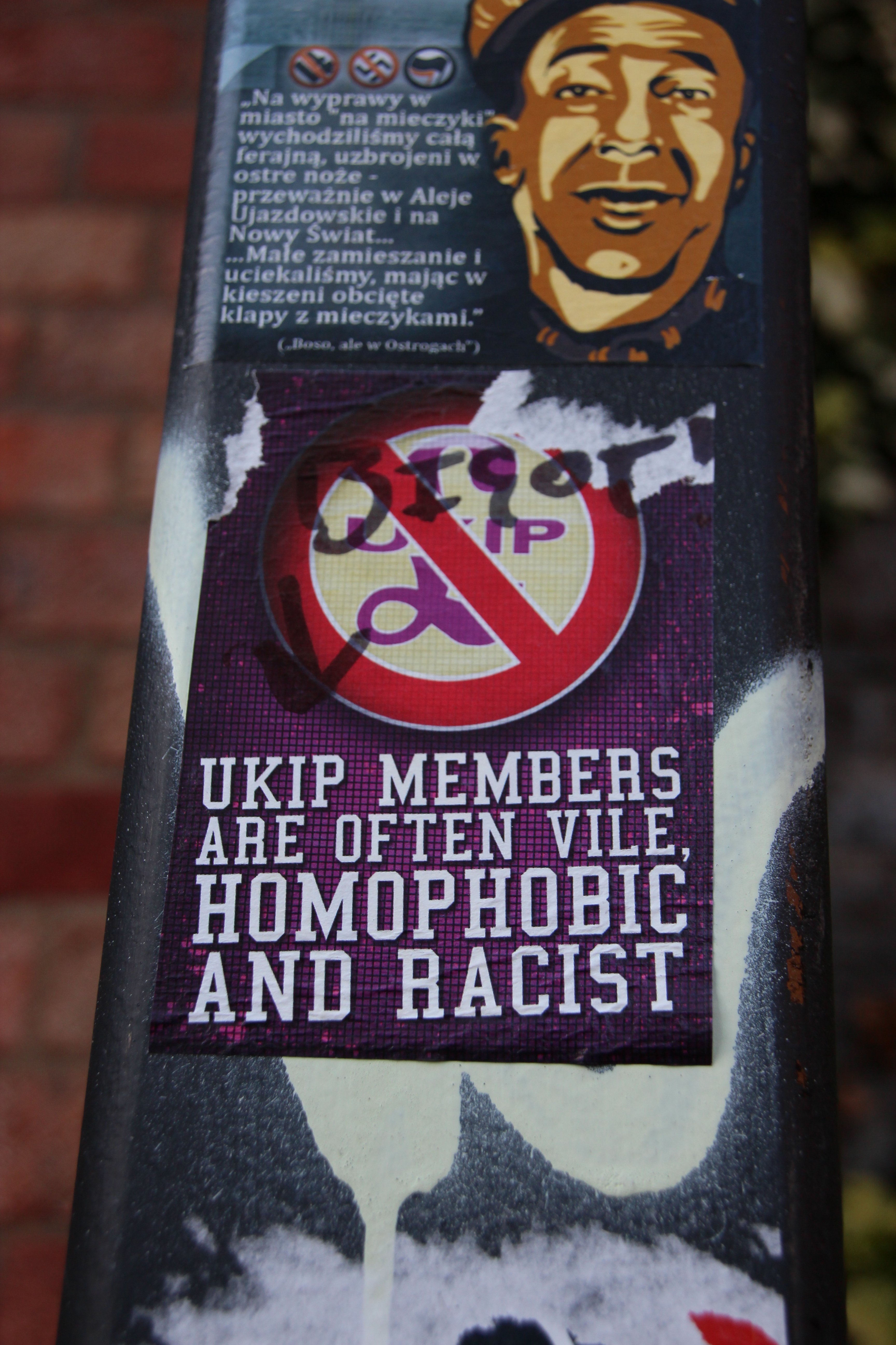 This sticker is another criticism of UKIP, but it has been grafittied, accusing the person who made the sticker of bigotry (Photo: Hannah Awcock, Regent’s Canal tow path, Camden, 20/05/15).