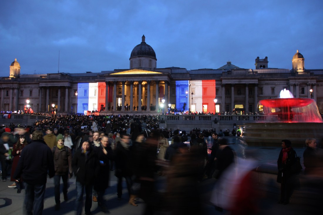 On Sunday afternoon, I was in Trafalgar Square during the vigil expressing sympathy and solidarity for Paris in the wake of the shocking events of the past week. The global condemnation of the shootings in Paris were instantaneous, and deafening. Gatherings took place around the world on Sunday to commemorate those who died and celebrate free speech. In London, several landmarks were lit up in the colours of the French flag including Tower Bridge and the National Gallery. People also gathered in several places including the French Embassy and Trafalgar Square. I don’t really know what to call what took place in Trafalgar Square, it seemed simultaneously to be protest, memorial and vigil. The BBC describe it as a ‘unity rally,’ but that doesn’t feel quite right to me either. It was obviously officially sanctioned and organised; Nelson’s column had been fenced off so that the French flag could be projected onto the National Gallery. To me, it felt like an expression of solidarity, sympathy and defiance. There were clearly lots of French people there, so it had a more personal feeling of grief too.