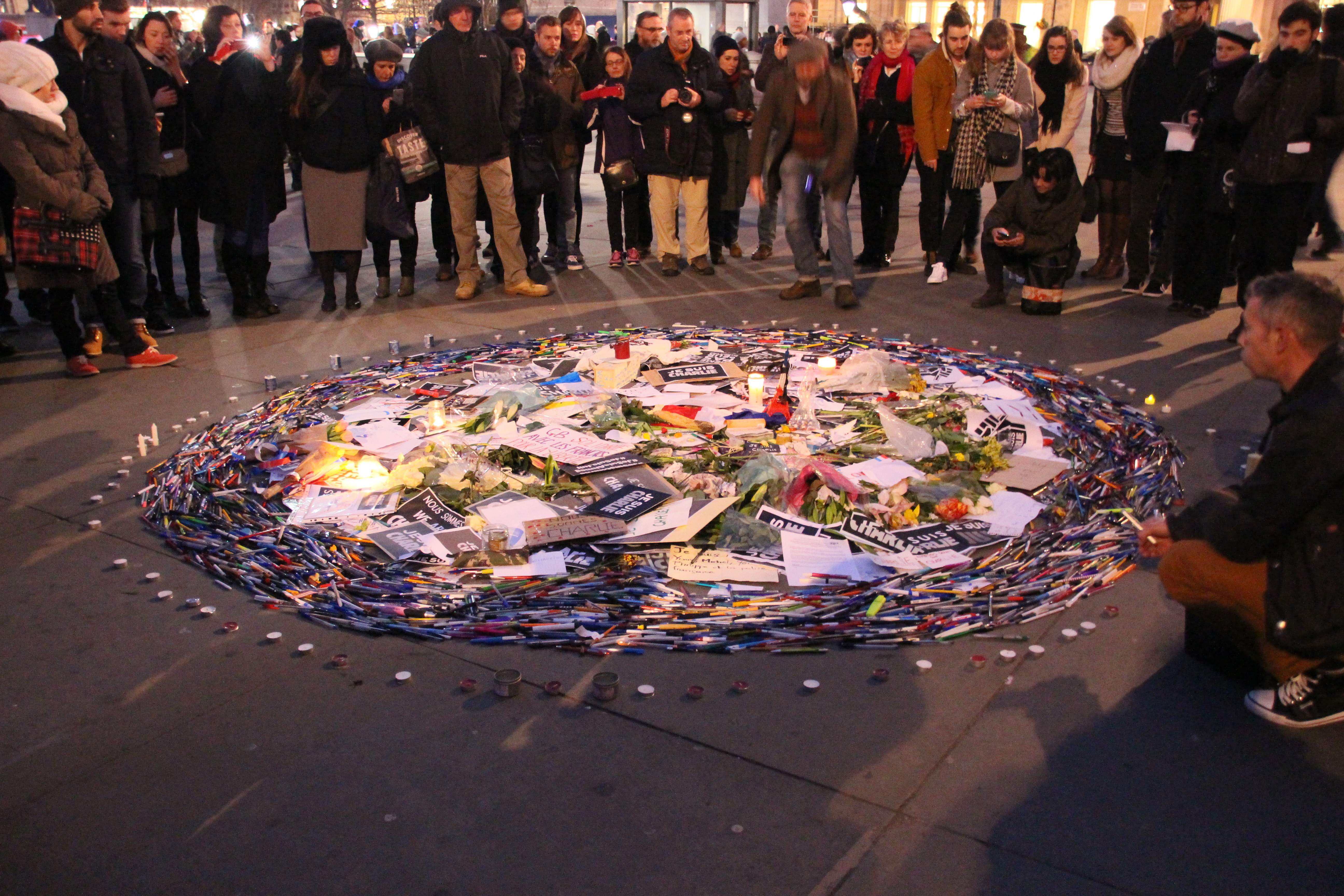 People left candles and pens in tribute and defiance (Photo: Graeme Awcock).
