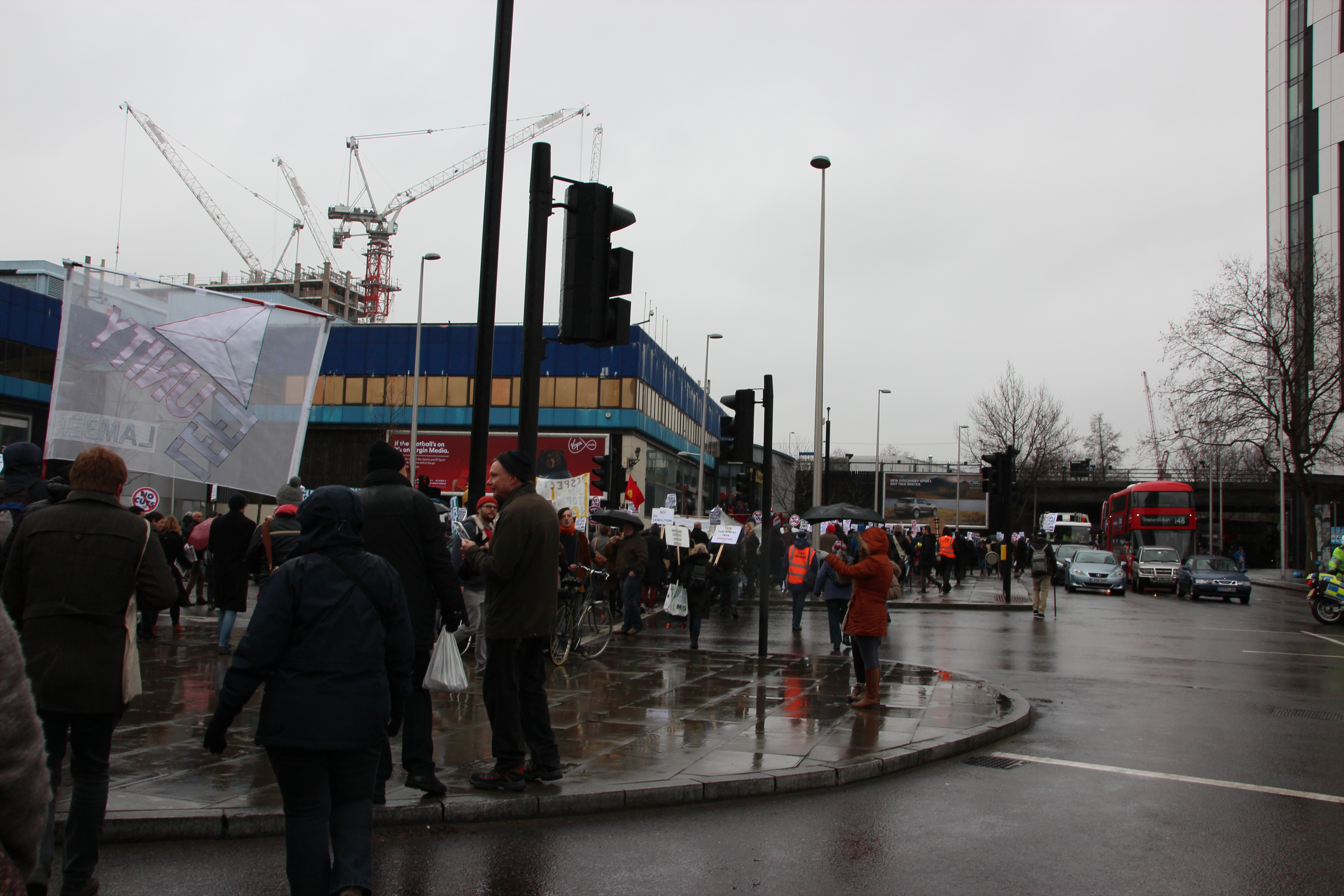 We marched through several large council housing estates on the way to City Hall. These are the areas in which people are directly affected by the crisis, and I hope that some of those took heart from the sight of us processing down the streets in the rain. Protests can be an expression of solidarity as well as a method of publicising a cause, and I hope that we did both today.