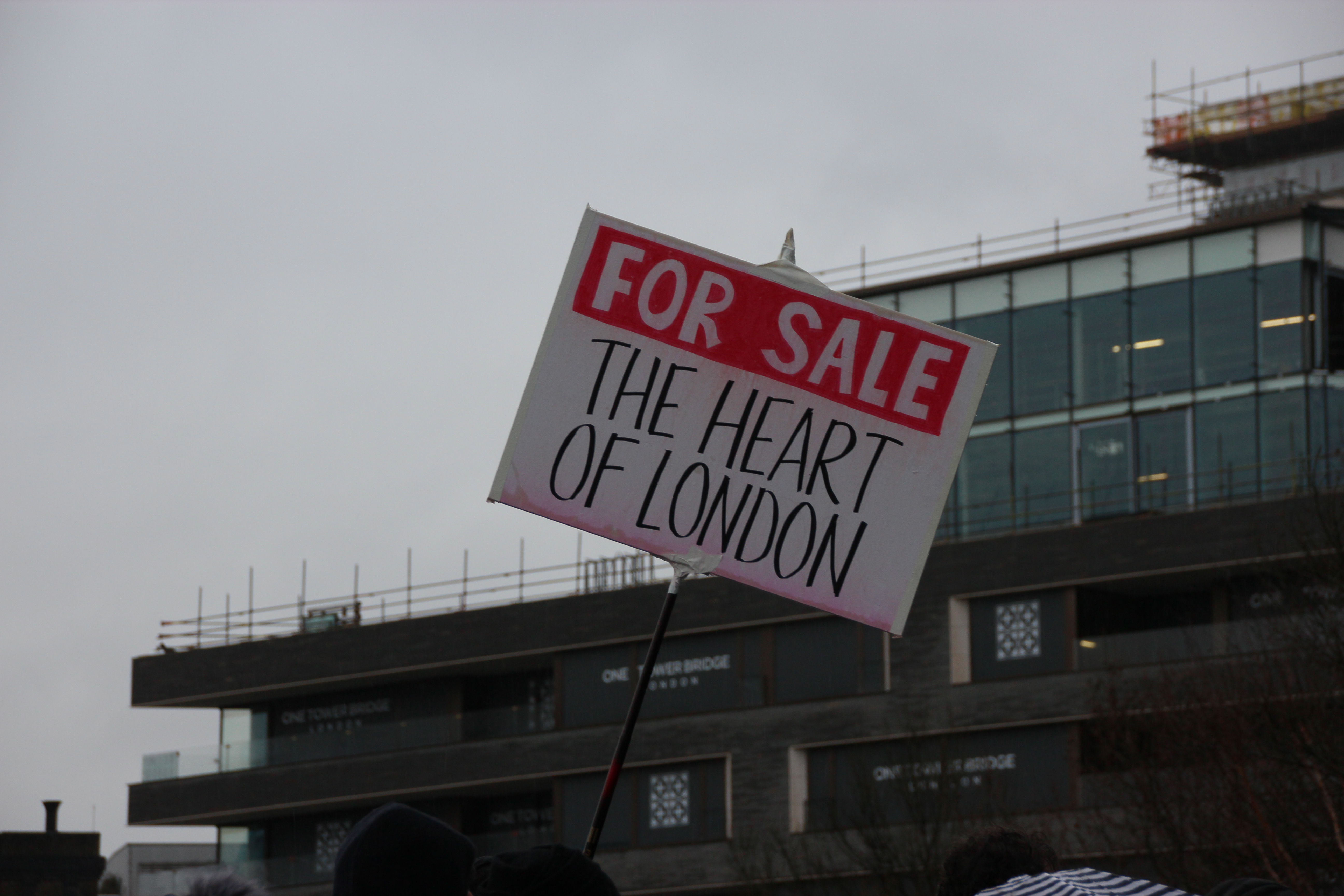 A placard in front of Tower Bridge, one of London’s most famous landmarks (Photo: Hannah Awcock).