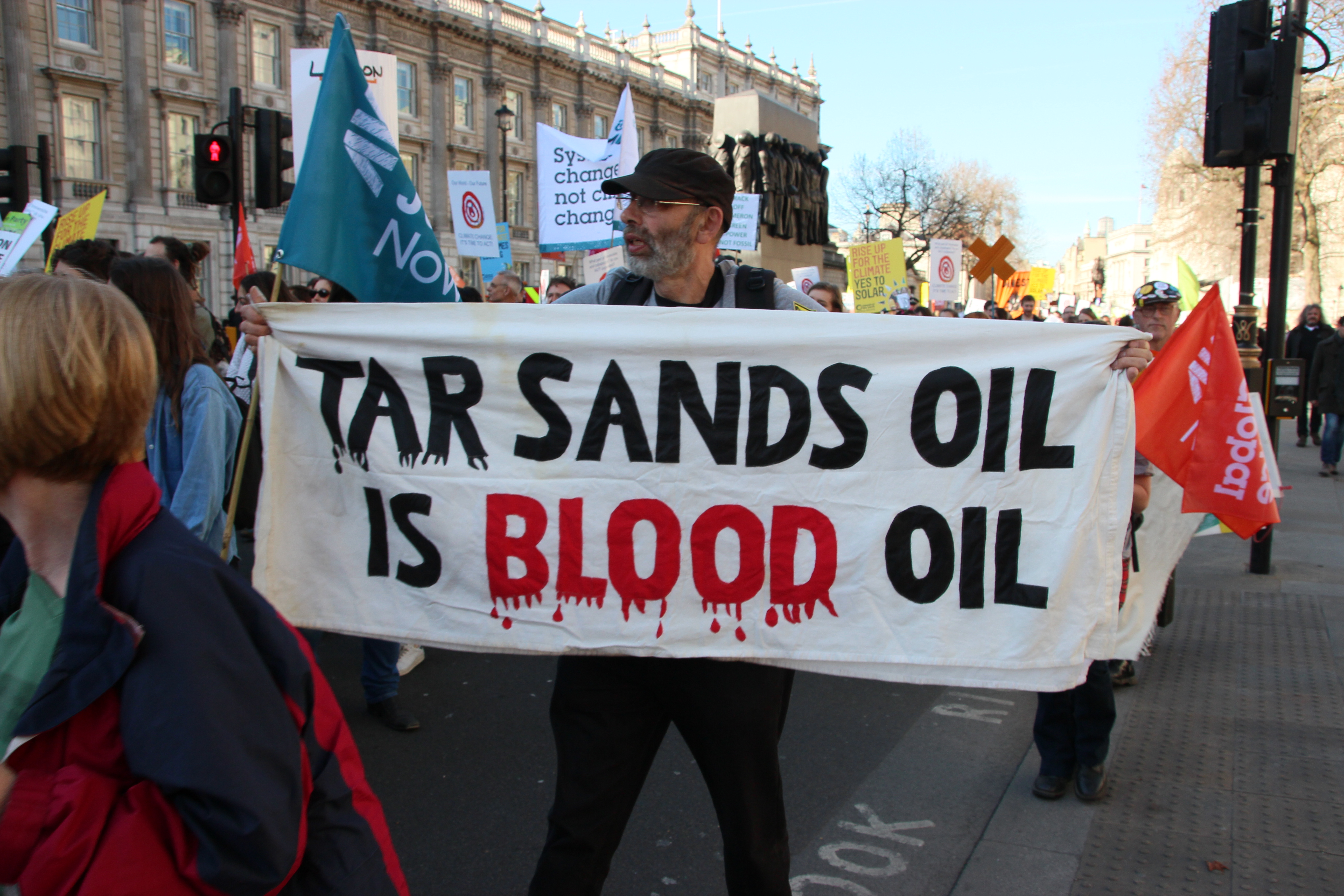 Whilst fracking was a popular topic of disdain for the marchers, this gentleman decided to focus on tar sands. Tar sands is not a method of fossil fuel extraction that is used in the UK, but many contemporary activists take an international approach to their campaigning (Photo: Hannah Awcock).