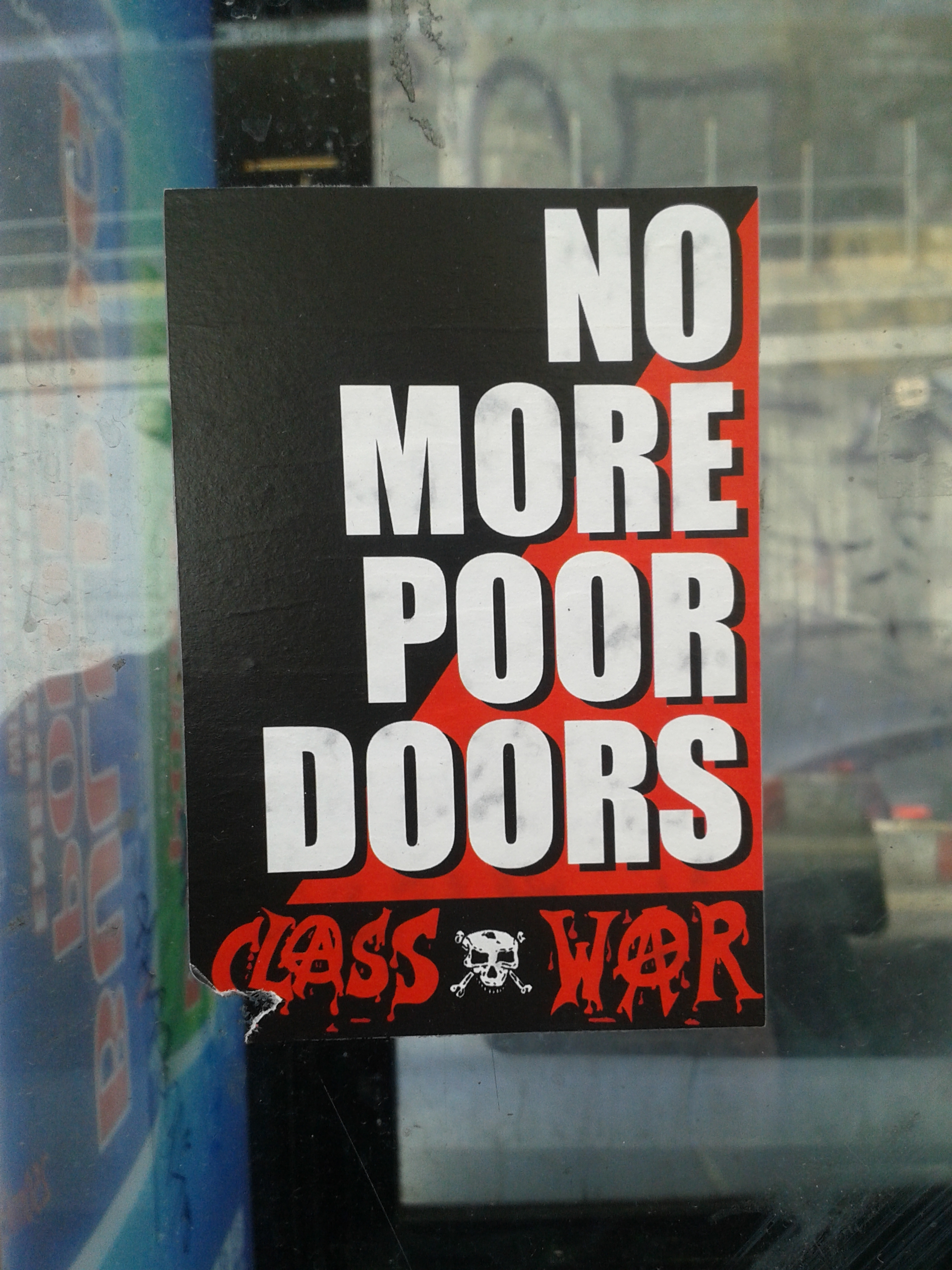 Over the past few months, it has come to light that some property developers build separate entrances for the social housing in their developments. This sticker is calling for an end to these ‘poor doors’ (Photo: Hannah Awcock, Elephant and Castle, 03/03/15).
