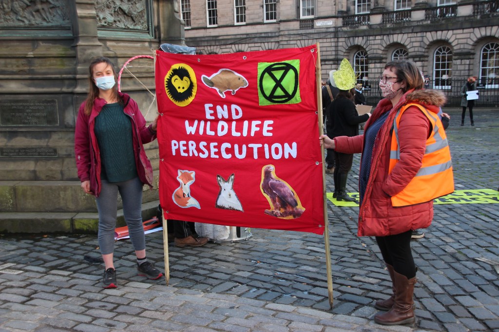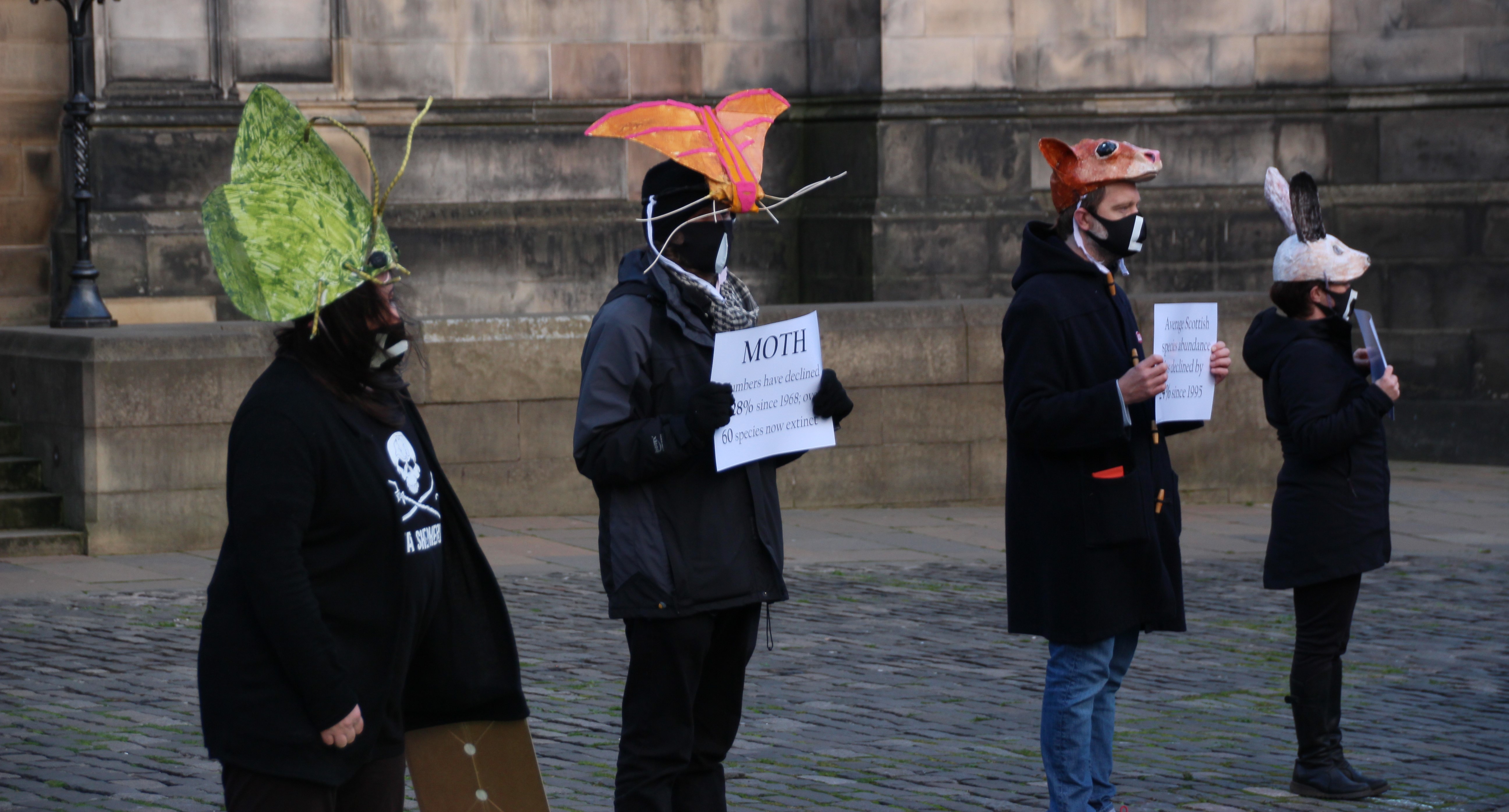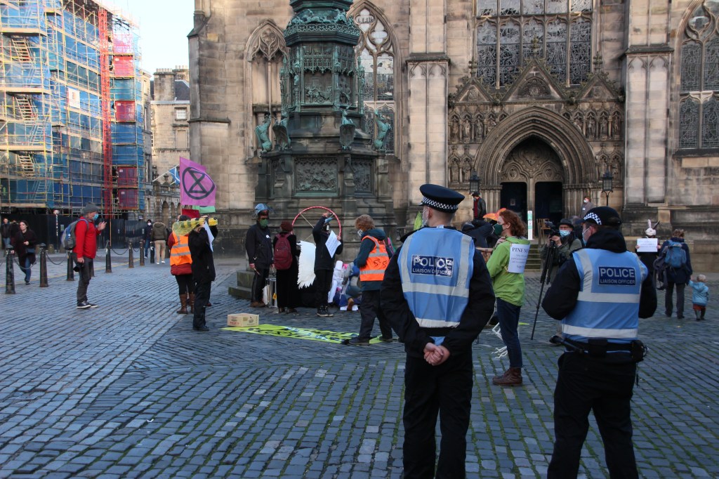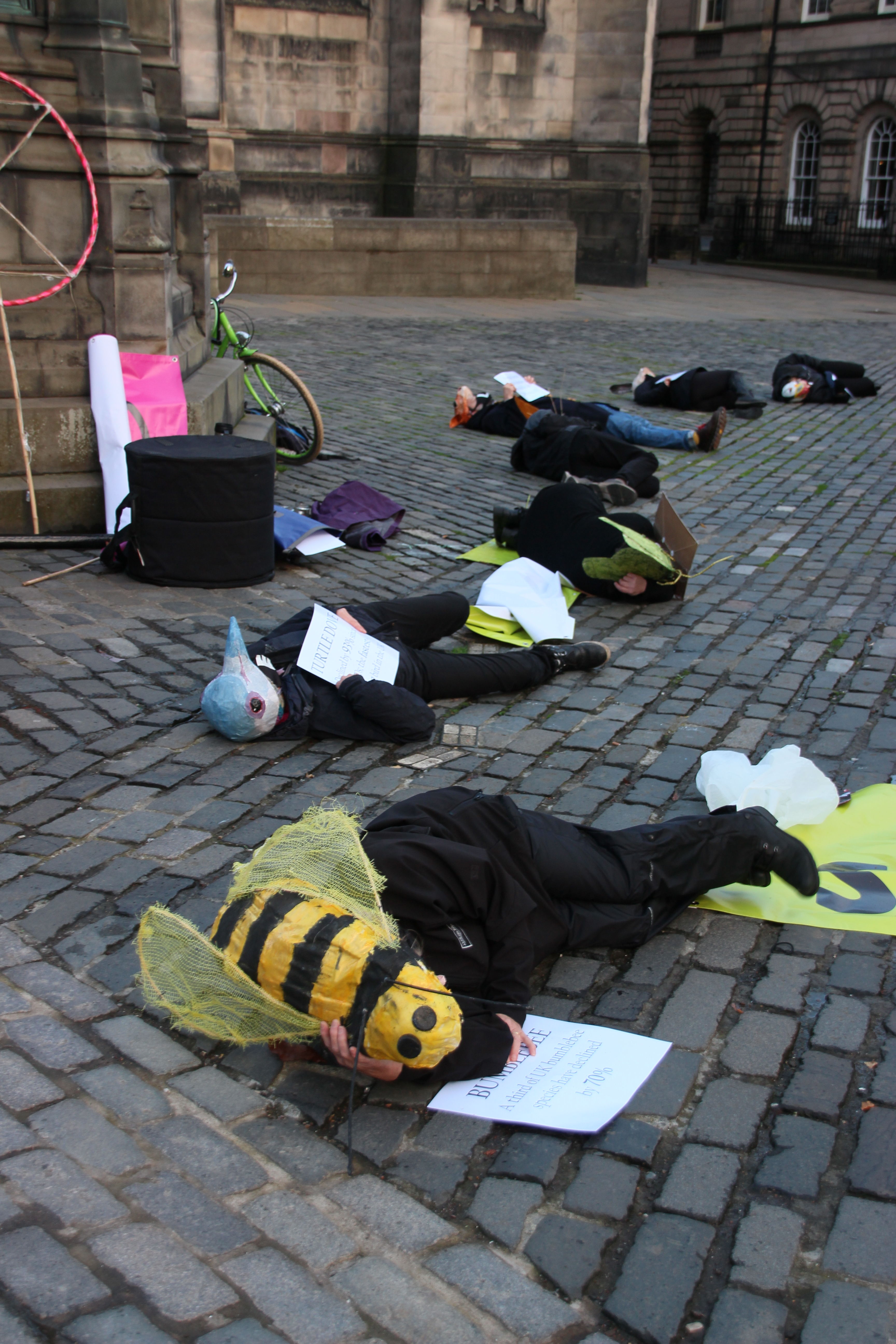 A die-in is a type of protest where activists simulate pretend to be dead. It is a tactic that Extinction Rebellion have used before. This die-in was designed to highlight the decline of wildlife in Scotland (Photo: Hannah Awcock).The protesters wore hats that represented different British and Scottish species (Photo: Hannah Awcock).They also displayed facts about the decline of each species (Photo: Hannah Awcock).After an ominous drum-beat, each activist read out the fact about their species, then lay down on the ground (Photo: Hannah Awcock).It wasn’t a large protest, there were maybe 20 activists involved, but they chose an effective way to get their point across (Photo: Hannah Awcock).This banner faced out onto the Royal Mile to convey the main message of the protest action to passersby (Photo: Hannah Awcock).After the die-in, another group of activists started to march down the Royal Mile from Edinburgh Castle. Again, it was a relatively small group (Photo: Hannah Awcock).Once the march reached the Scottish Parliament the activists arranged their banners for photographers and observers. There was one or two speeches, but I got the impression that these were more for the activists themselves than any observers (Photo: Hannah Awcock).This was the first protest I have attended since social distancing and face masks became necessary. It felt like a more muted experience, but that could also have been because the numbers were relatively small. I am impressed with the way that activists are adapting their strategies and tactics to this new normal though (Photo: Hannah Awcock).There was a visible police presence throughout the protest, and there were several police vans parked nearby that presumably contained more officers. It felt over the top, but wasn’t too intimidating (Photo: Hannah Awcock).
