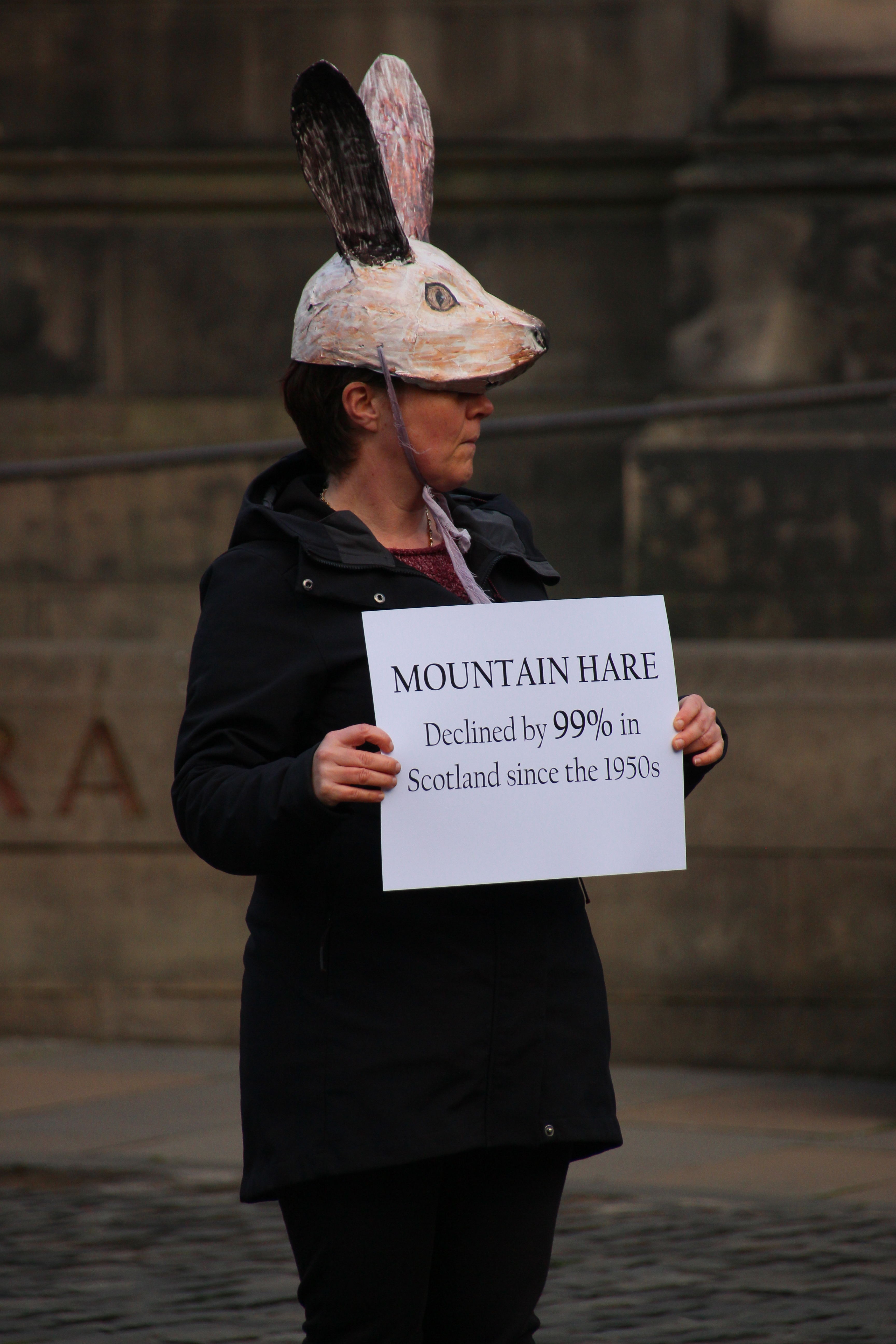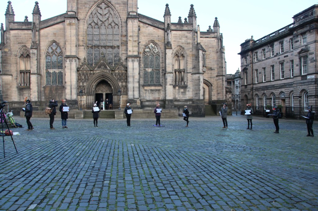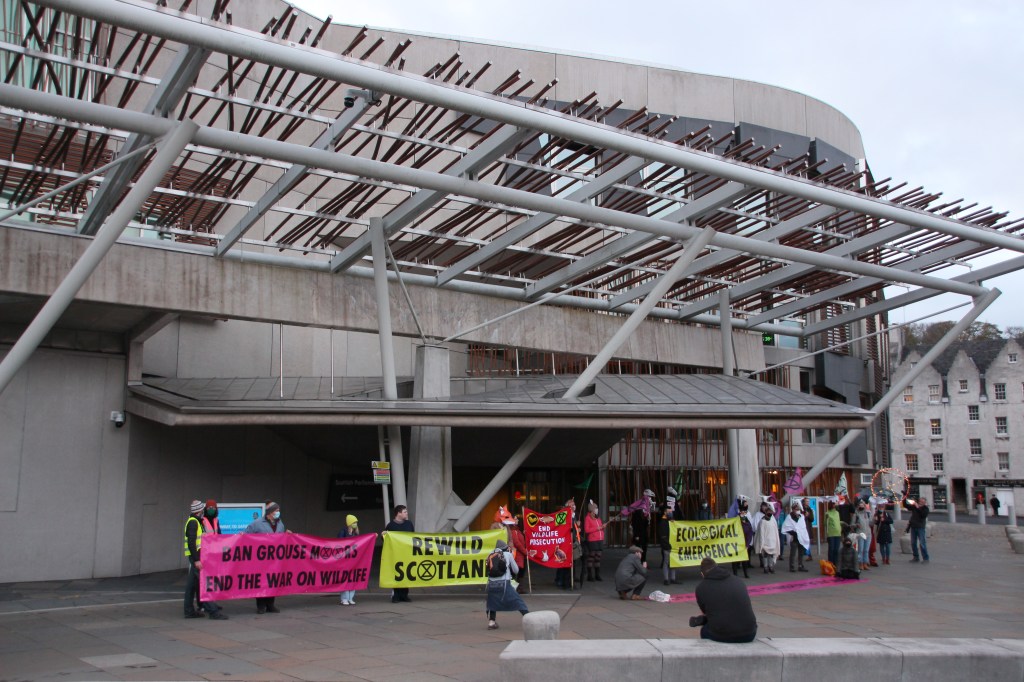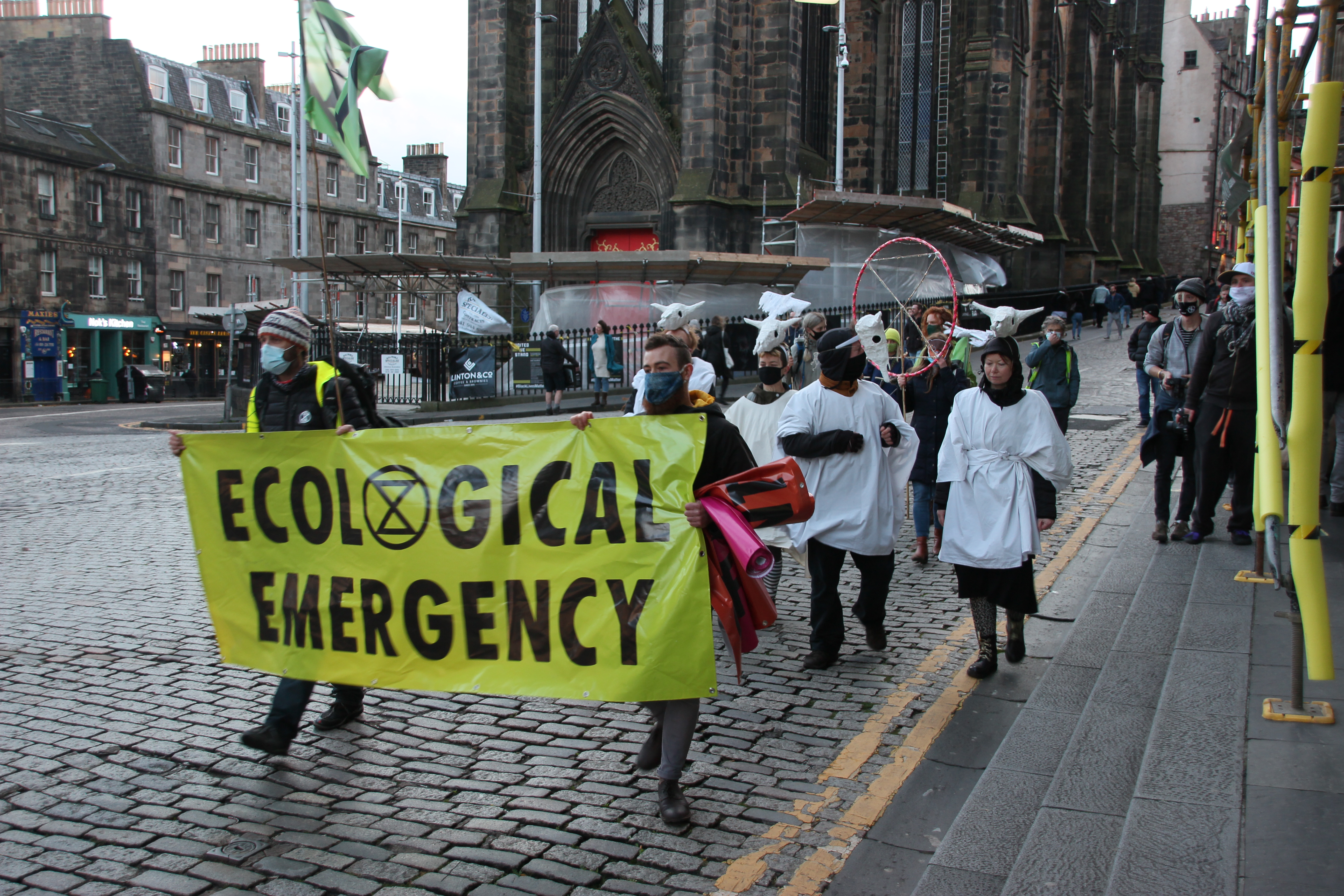 A die-in is a type of protest where activists simulate pretend to be dead. It is a tactic that Extinction Rebellion have used before. This die-in was designed to highlight the decline of wildlife in Scotland (Photo: Hannah Awcock).The protesters wore hats that represented different British and Scottish species (Photo: Hannah Awcock).They also displayed facts about the decline of each species (Photo: Hannah Awcock).After an ominous drum-beat, each activist read out the fact about their species, then lay down on the ground (Photo: Hannah Awcock).It wasn’t a large protest, there were maybe 20 activists involved, but they chose an effective way to get their point across (Photo: Hannah Awcock).This banner faced out onto the Royal Mile to convey the main message of the protest action to passersby (Photo: Hannah Awcock).After the die-in, another group of activists started to march down the Royal Mile from Edinburgh Castle. Again, it was a relatively small group (Photo: Hannah Awcock).Once the march reached the Scottish Parliament the activists arranged their banners for photographers and observers. There was one or two speeches, but I got the impression that these were more for the activists themselves than any observers (Photo: Hannah Awcock).This was the first protest I have attended since social distancing and face masks became necessary. It felt like a more muted experience, but that could also have been because the numbers were relatively small. I am impressed with the way that activists are adapting their strategies and tactics to this new normal though (Photo: Hannah Awcock).There was a visible police presence throughout the protest, and there were several police vans parked nearby that presumably contained more officers. It felt over the top, but wasn’t too intimidating (Photo: Hannah Awcock).