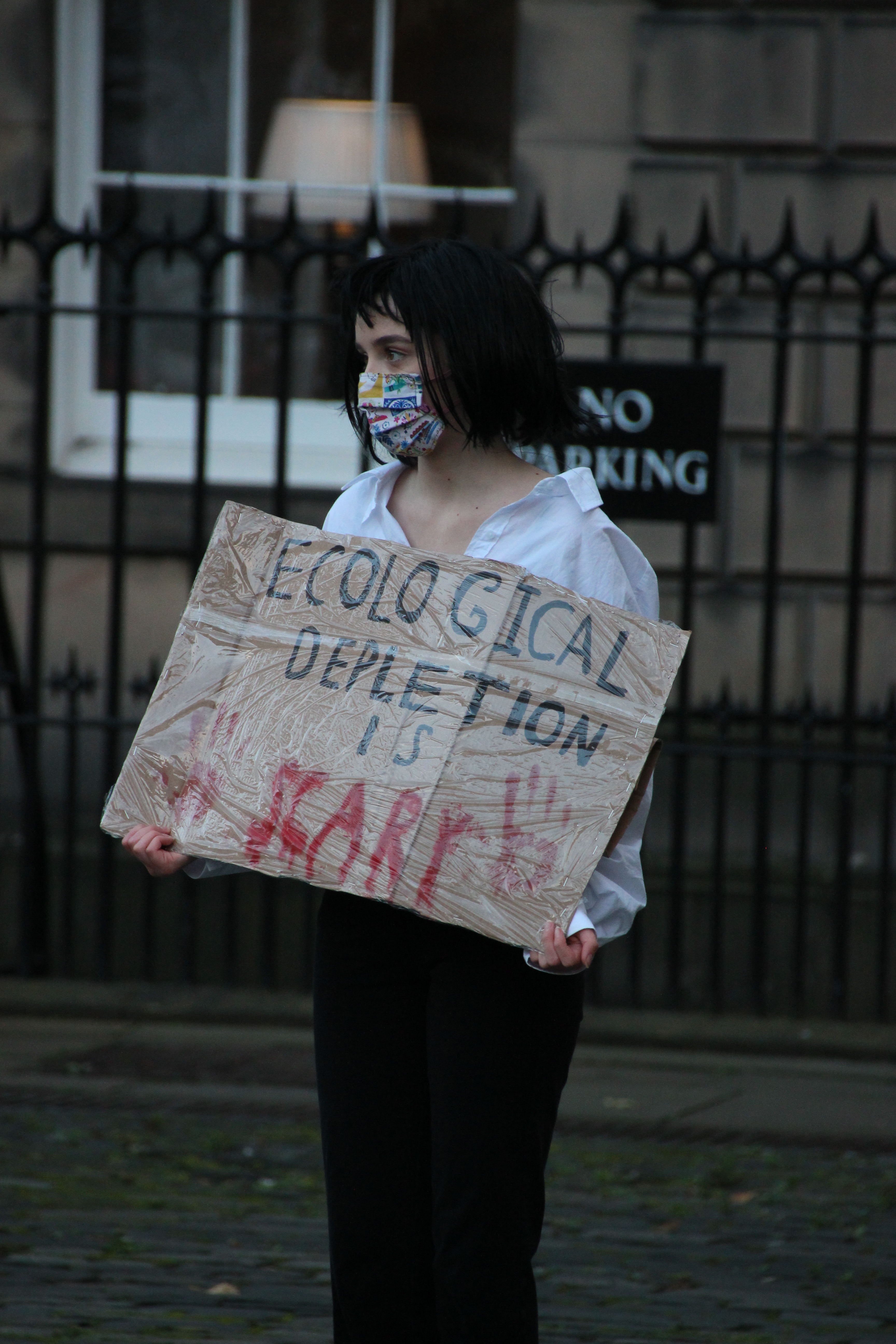 An Extinction Rebellion protester with a Halloween themed placard in West Parliament Square (Photo: Hannah Awcock).
