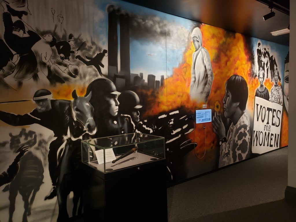 The National Justice Museum contains a Victorian courtroom, a Georgian gaol, and cells that date back to the Saxon era. You have to pay to visit these, but the museum also has some free exhibition spaces. The largest one of these, The Crime Gallery covers a broad range of themes including Protest, Riot and Terrorism. If I’m honest, this gallery was much more even-handed and critical than I thought it would be, encouraging visitors to think about what crime is, and who gets to decide what is (il)legal. This gallery contains a jukebox playing protest songs and a mural by local artist Neequay Dreph depicting local, national, and international protest events.