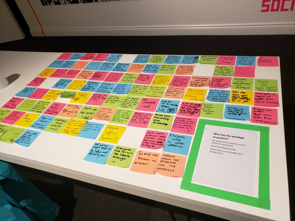 Responses from exhibition visitors to the question ‘Who has the privilege to protest?’ (Photo: Hannah Awcock).