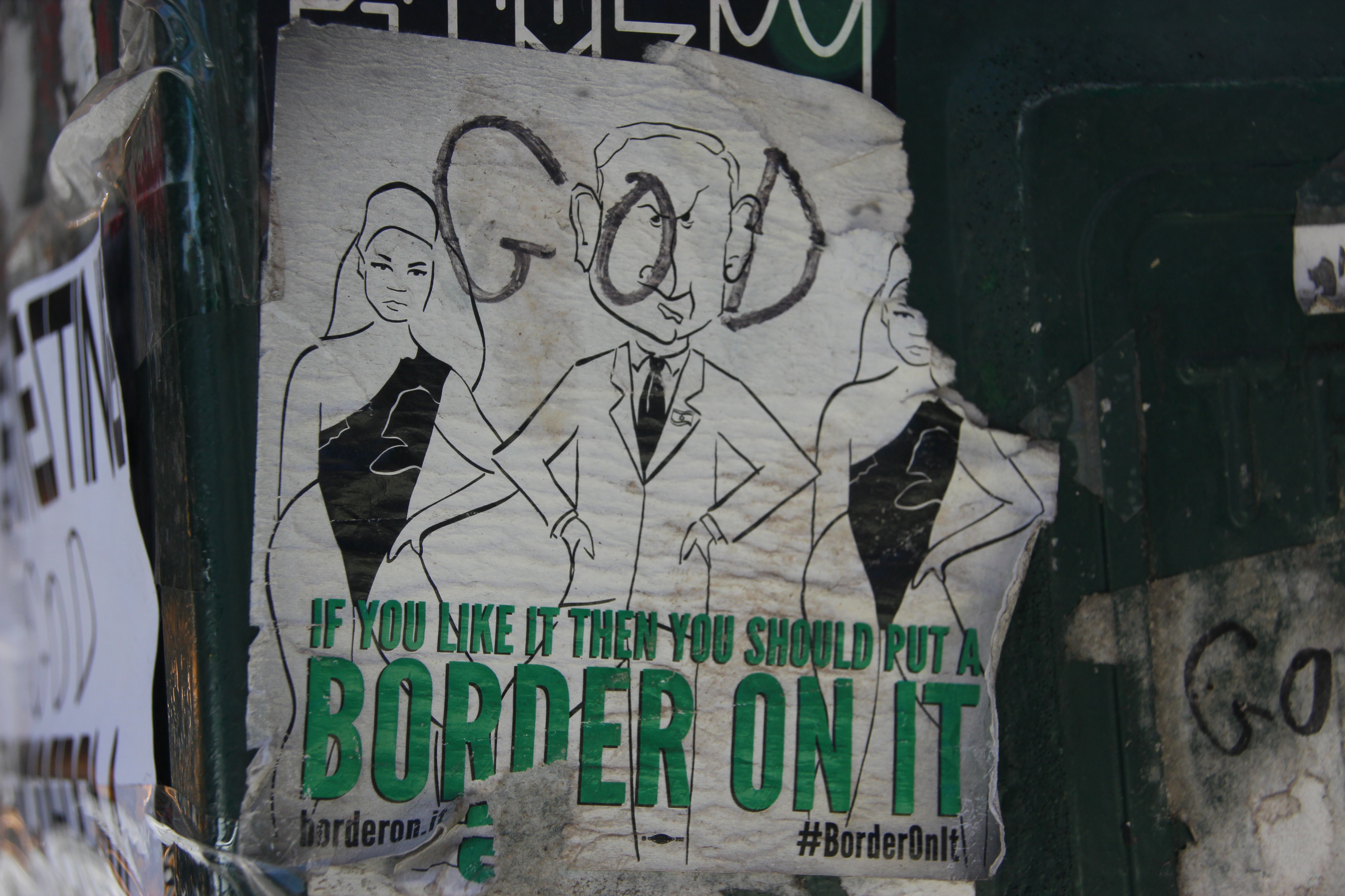 Some issues that are common subjects of protest stickers in London also occur in New York, like this one advocating a boycott of Israeli produced goods (Photo: Hannah Awcock).