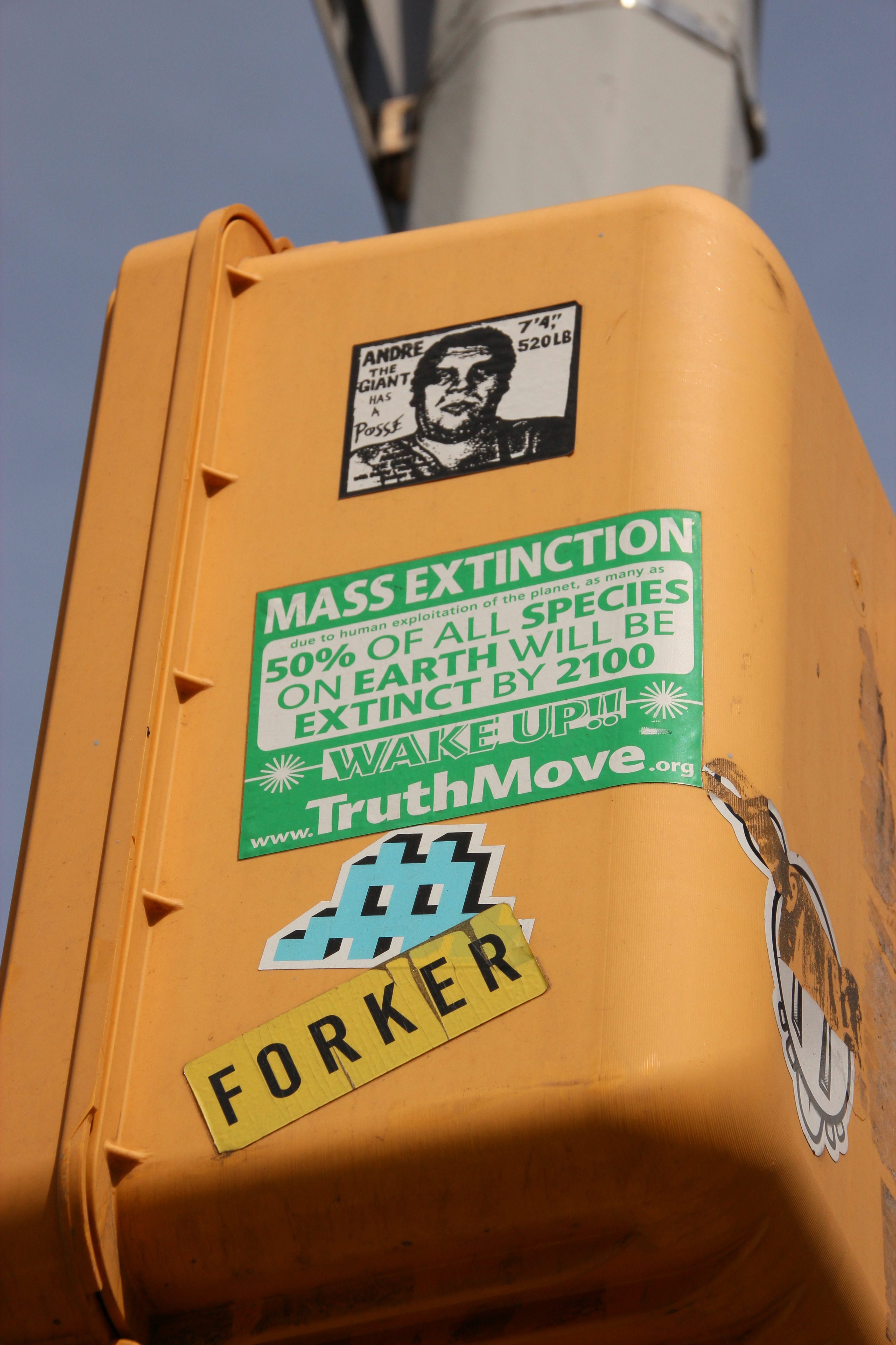 Last week I talked about some of the most common themes that came up in protest stickers, police brutality and the upcoming Presidential election. Animal rights was another common theme; this sticker contains the web addresses of meatvideo.com, which shows abuse at factory farms, and In Defense of Animals, a group which campaigns for animal rights, welfare and habitat (Photo: Hannah Awcock).