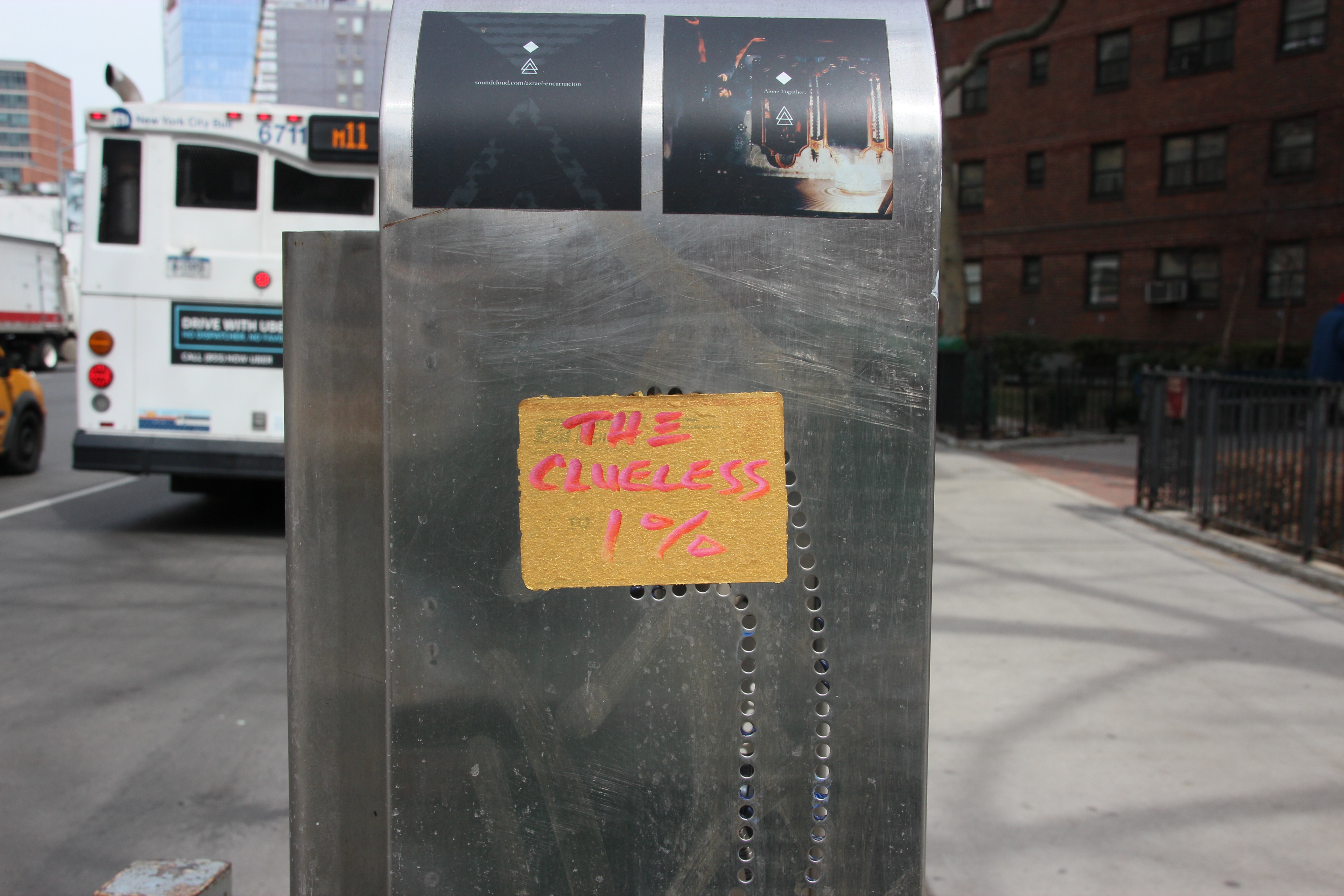You can find stickers about a whole range of issues, relating to a whole range of scales. The relevance of this sticker is confined to New York City (Photo: Hannah Awcock).