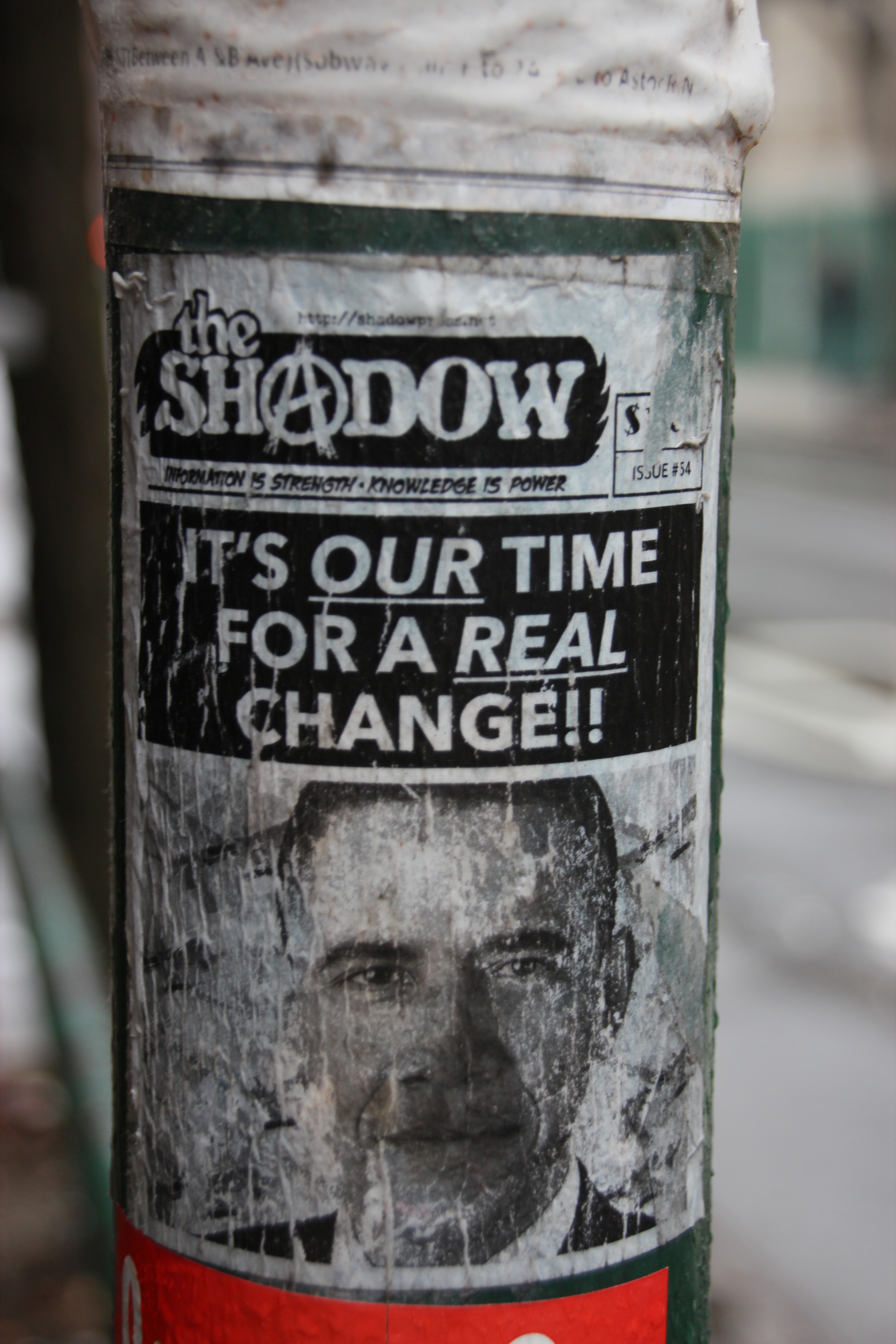 This sticker also refers to Obama. I saw sever different issues of ‘The Shadow’ whilst in New York (Photo: Hannah Awcock).
