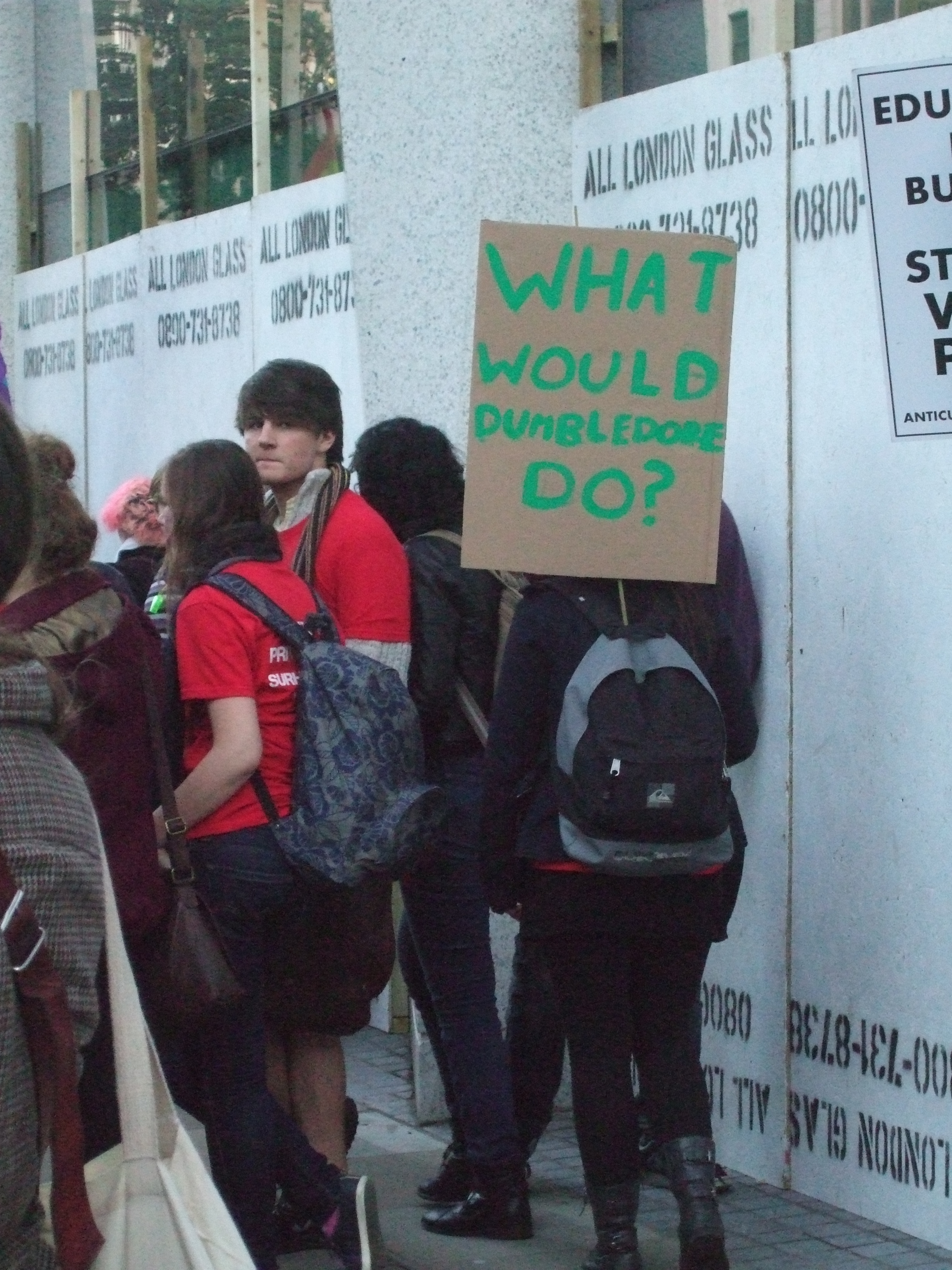 As I’m sure many of you have, I’ve been following the events of the pro-democracy demonstrations in Hong Kong very closely. The protests, known to some as the ‘Umbrella Revolution’ because of protesters using umbrellas to protect themselves from tear gas, have been going on for some weeks now. The protesters accuse the Chinese government of reneging on multiple promises to allow Hong Kong a free and fair democracy by placing restrictions on who is allowed to run for the position of Chief Executive, effectively Hong Kong’s leader, in 2017 (for more information about the Hong Kong demonstrations, see http://www.bbc.co.uk/news/world-asia-29413349). An end appeared to be in sight as talks between the government and the protesters were scheduled for this Friday (the 9th of October), but they were called off the day before they were due to take place. One of the things that struck me as I have watched events unfold is the many similarities between the protests in Hong Kong, and many recent demonstrations in London. One example is the playful, light-hearted approach some protesters take, evidenced in placards and banners made and carried by the demonstrators.