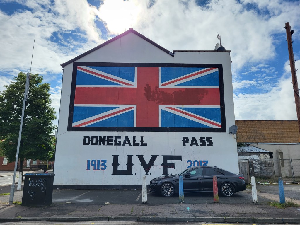 I took my car over to Belfast from Scotland on the ferry, so we used a website to rent someone’s driveway whilst we were in the city (it’s a bit like AirBnB but for cars). When we arrived in the neighbourhood, we were taken aback by the loyalist flags and murals that adorned walls and lampposts. It is one thing to expect to find a lot of political murals in a city, it is quite another to turn a corner into a street an immediately be able to tell the political allegiances of it’s residents. Politics in Belfast is highly visible in public spaces of residential areas.