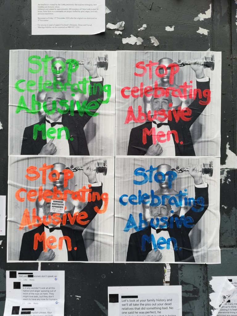 The death of actor Sean Connery on the 31st October 2020 sparked a predictable outpouring of grief and admiration, particularly in his home city of Edinburgh. Not everyone mourned his loss, however. It was well known that Connery physically abused women. On several occasions he explained how he felt entitled to hit women who ‘deserved’ it, and his first wife Diane Cliento accused him of sustained physical and mental abuse during their marriage. Many people, myself included, didn’t know about this until after Connery’s death, and False Idols questions how such a man could be celebrated as a national hero.