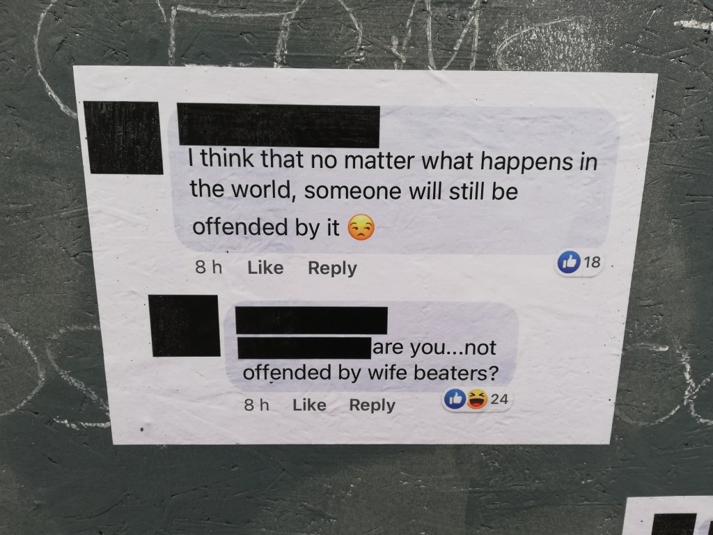 It is generally accepted that people say things on social media that they wouldn’t be willing to say in ‘real life’. So it is interesting to see the language of social media transposed onto the public space of Leith Walk. The comments have been anonymised, but I wonder how the commenters would react if they suddenly saw their own words as they walked past. Would they regret their choice of words, or their tone? Or would they stand by them? Would they be upset, angry, or proud that their opinions have been plastered onto the physical fabric of Leith? Would they even recognise their own words in this strange context?