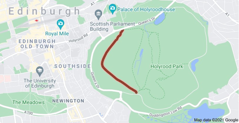 The Radical Road runs through Holyrood Park (highlighted in red). The name feels out of place for a royal park (Source: Google).