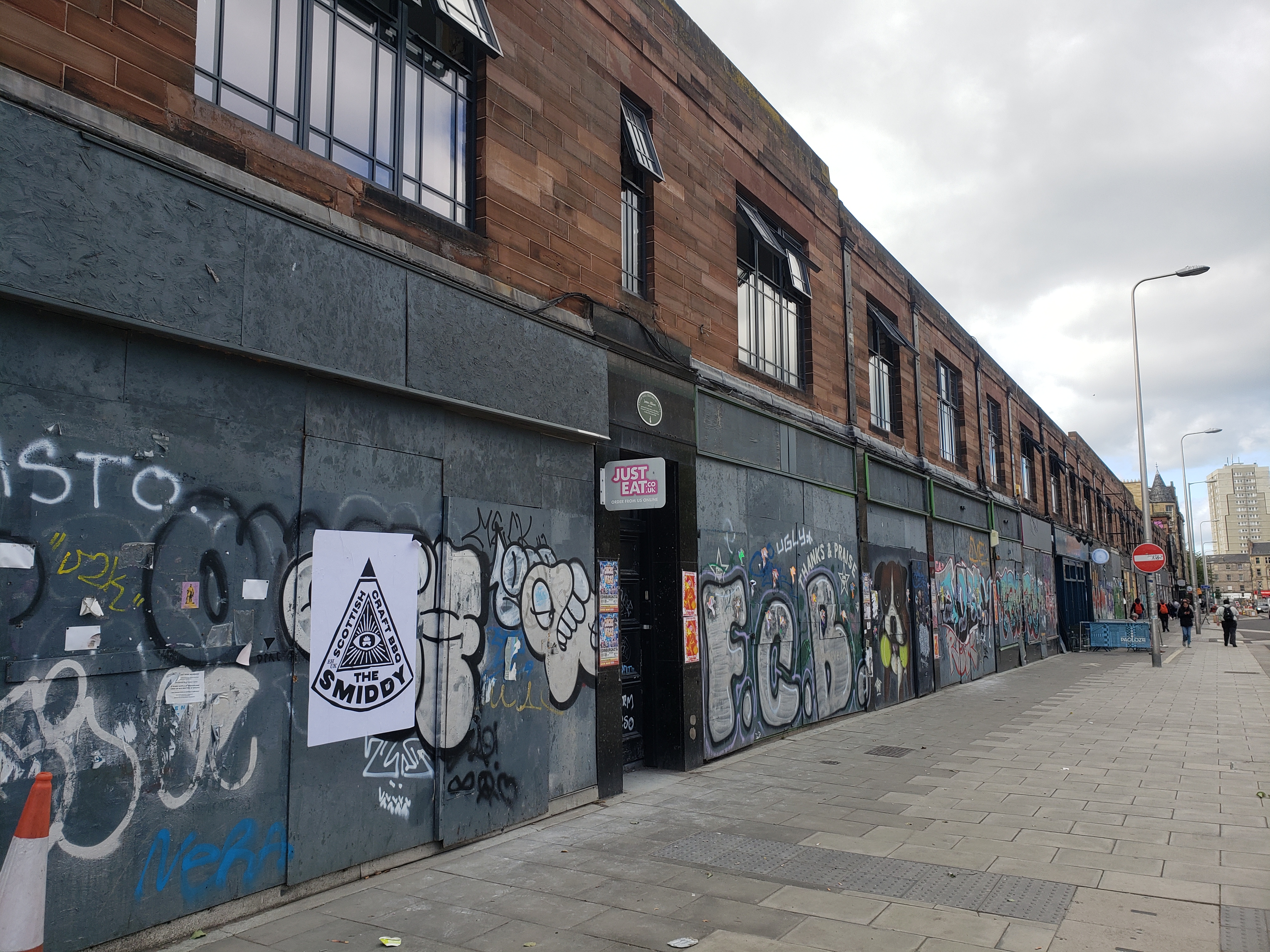 Towards the Leith end of Leith Walk is a long red sandstone building. 106-154 Leith Walk is currently the focus of a bitter struggle between developers who want to demolish the building to build student housing and the grassroots campaign group Save Leith Walk. In January 2019 planning permission for the new development was denied, a significant victory for the community group. New plans have been submitted that propose to keep the building intact and reopen it as commercial spaces, but in the meantime the shop fronts remain boarded up. The dark gray wooden boards have come to serve a purpose of their own however, as a sort of community pin board. Slogans, street art, and other miscellanea appears, disappears, and reappears often. One of the most recent installations is called False Idols, by Creative Electric.