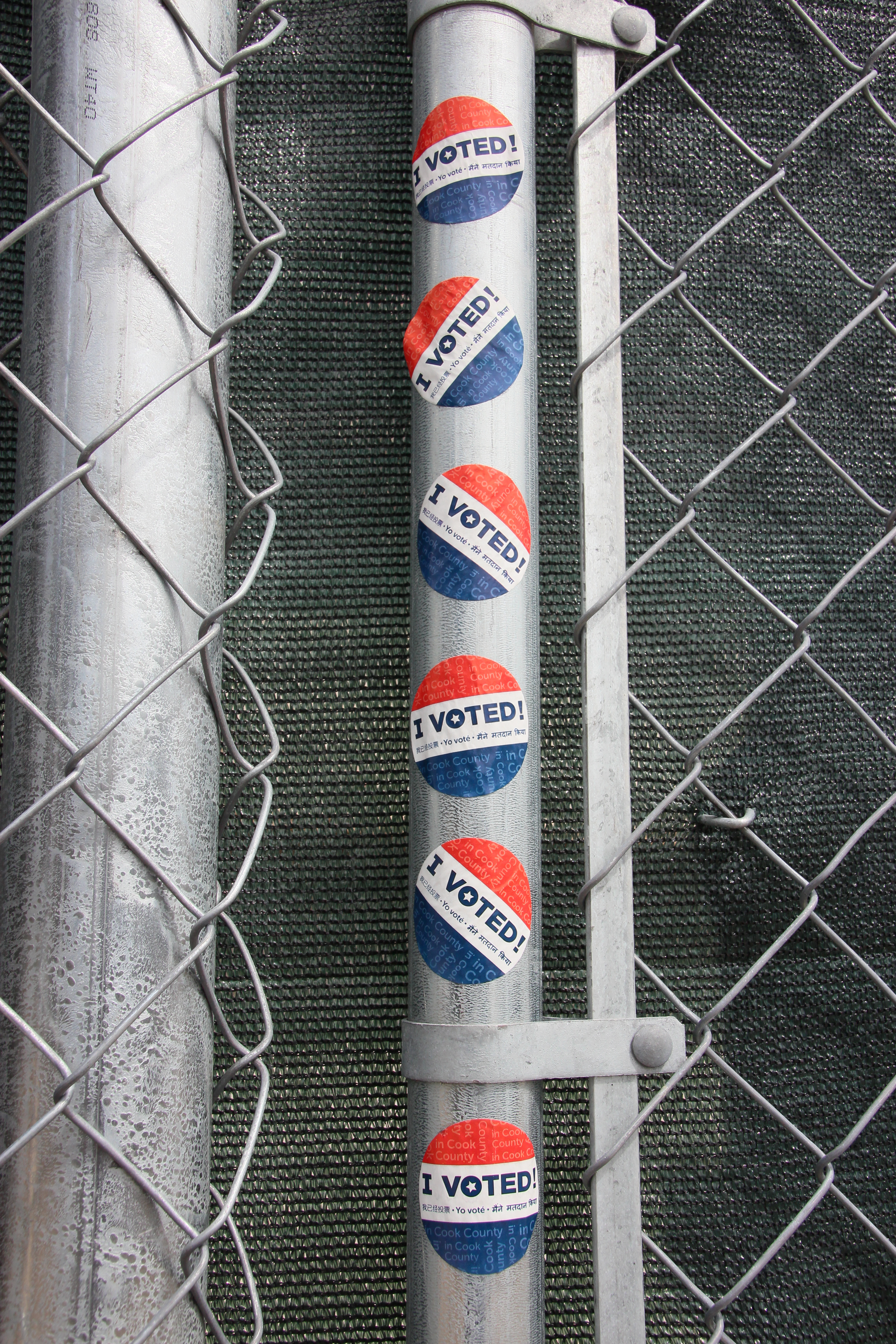 These stickers also relate to electoral politics. I assume they were handed out at a polling station, but I don’t know how they ended up on this chain link fence close to Lake Michigan (Photo: Hannah Awcock).