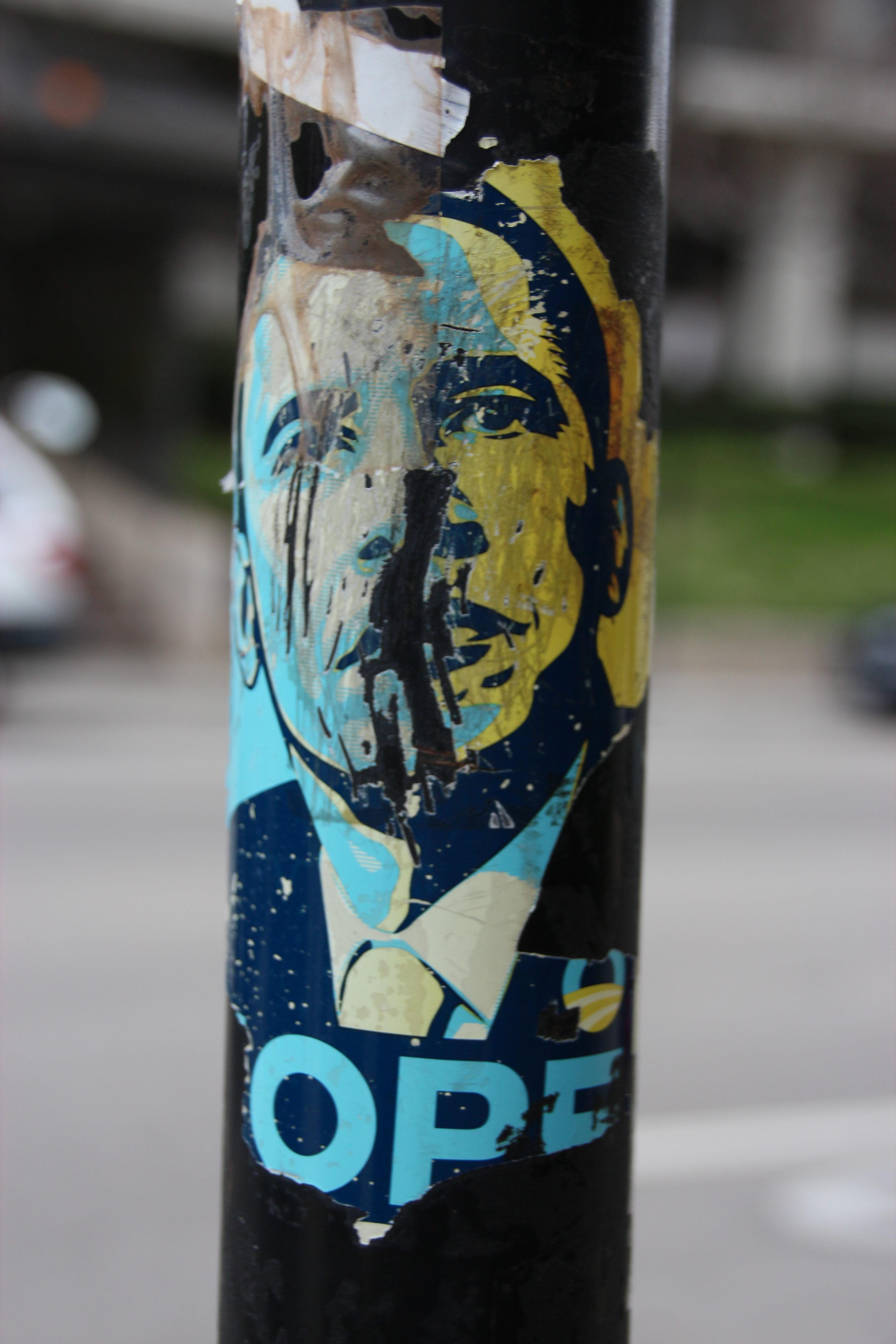 This sticker is a version of the poster designed for Barack Obama’s 2008 election campaign, which normally has a red and blue colour scheme. It was designed by the street artist Shepard Fairey, who’s Obey street art is world-famous (Photo: Hannah Awcock).